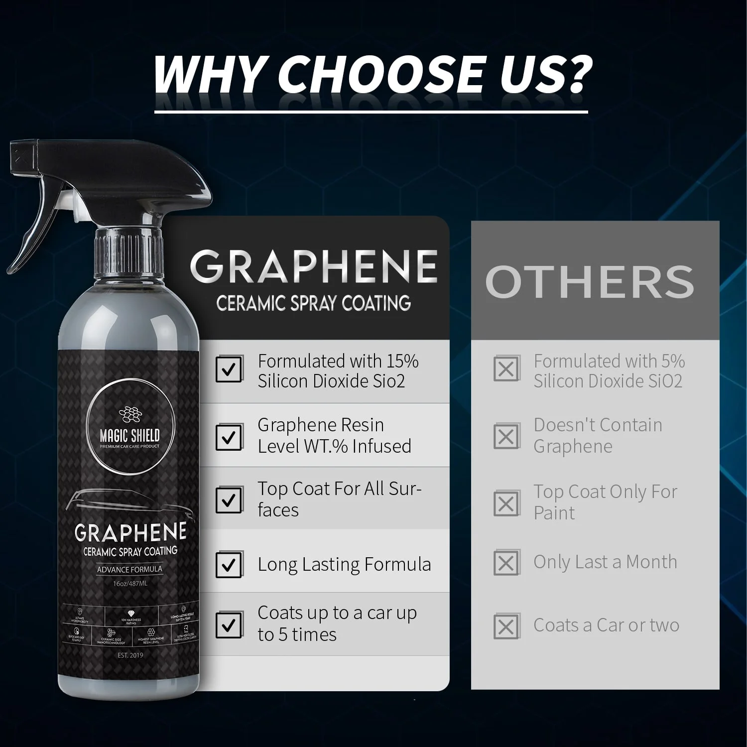 Magic Shield Graphene Spray’s advanced graphene-based formula creates a protective layer that defends against scratches, chips, and other damage, ensuring prolonged beauty for your vehicle.